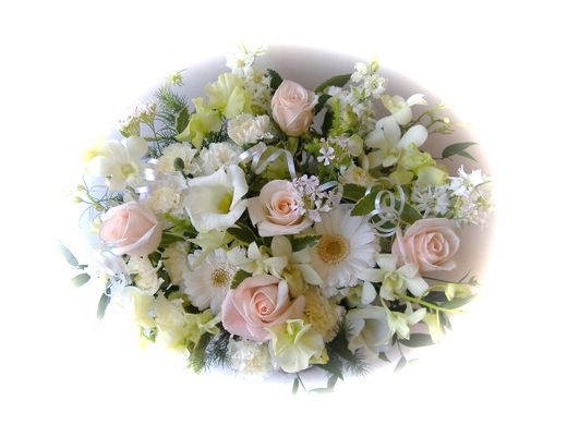 静かな色合いのお花で大事な方にお弔いの気持ちをお届けさせていただきます、百合の香りも風に微かに揺れる花びらも、故人に語りかけているようですよ。